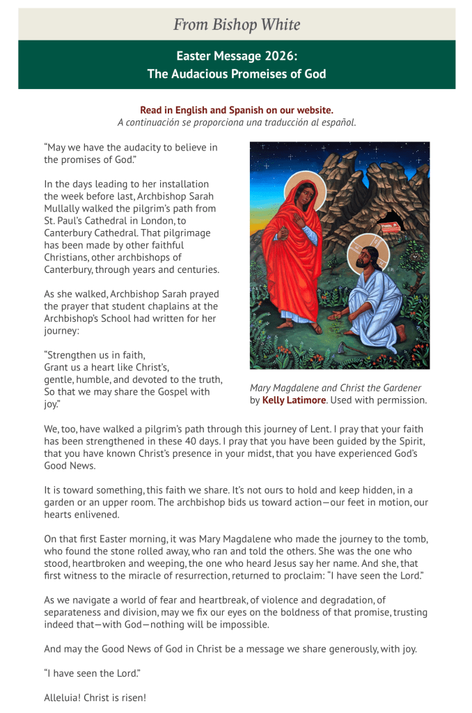 Every act of courage matters. We must keep showing up for one another. We are bound together because we are all made in the image of God. This begins with small, faithful steps. As bishops in the Episcopal Church, we promise to keep
